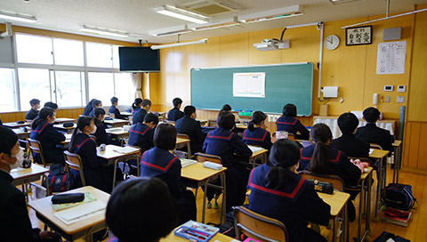 3年生と保護者を対象に、入試の仕組みや日程、就学支援制度に関する説明が行われました。進路選択においては、3年後、5年後、10年後の自分に見通しを持ち、自分の意志で志望校を決定することが大切だと考えます。