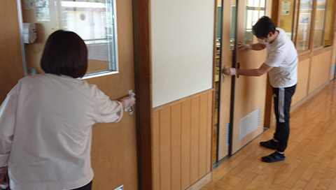 5月8日(金)、新型コロナウィルス感染症対策のため、校内の消毒作業を教職員で実施しました。教室内の机やいす、ドア、スイッチ、ロッカー、廊下、トイレ、階段の手すりなど、子どもたちの手に触れやすい場所を重点的に消毒しました。
