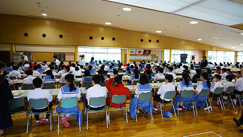 5月25日(月)-26日(火)、学校再開に向けた段階的措置として、一斉登校による3時間の授業が実施されました。また、本日27日(水)からは、簡易給食を含む5時間の授業が実施されています。クラス全員が集うのは、始業式以来、7週間ぶりのことです。子どもたちの元気な挨拶の声が、校舎に響き渡りました。