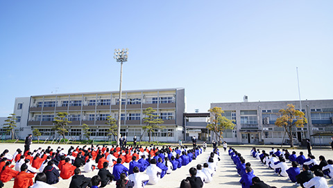 甘木・朝倉消防署西部分署の協力を得て、地震から生徒の安全を確保することを目的とした避難訓練が行われました。子どもたちは揺れが収まるまで机下で体勢を低くし、指示に従い運動場へ避難しました。