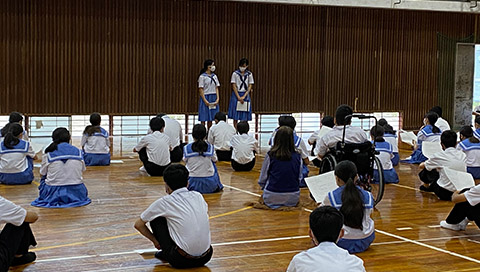 子どもたちが「命」の大切さを考え、思いやりの心を見つめ直すことを目的とし、毎年この日を「絆の日」としています。昨年度から始まった生徒会自作のドラマは、今年度「つむぐ」をテーマに構成され、学校の課題が提起されました。