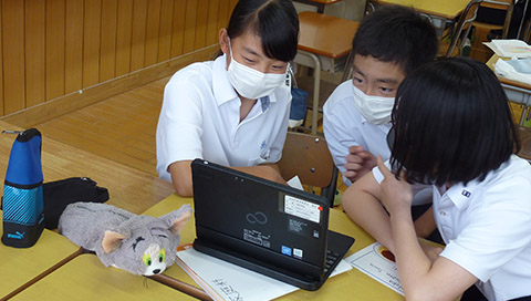 EWSとは、筑前町英語教育推進事業の一環として、『筑前町全中学生を対象に、様々な国の人と英語でのコミュニケーション活動を行うことで、「話す・聞く」ことへの意欲を高め、英語力向上への素地を育む。』ことを目的としてスタートした取り組みです。例年であれば、APU(立命館アジア太平洋大学)から留学生や学生の約40名と交流する計画でしたが、感染症予防の観点からZoomを活用し、オンラインで行われました。英語を聞き取ることは難しそうでしたが、身振り手振りなどジェスチャーを使って、グループで協力しながら、楽しく活動できました。(R3.06.04)