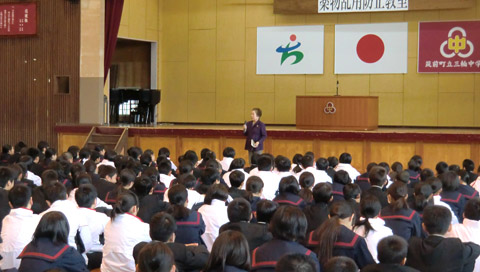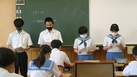 緊張していたけど、気持ちを込めて話すことができてよかったです。私たち学級人権委員が話したことでもっともっといいクラスになってほしいです。それができたら、このクラスだけではなく、学年、三輪中、他の学校へと、どんどん広がっていってほしいと思います。