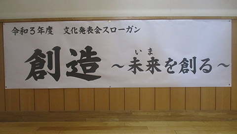 「創造〜未来(いま)を創る〜」のスローガンのもと、リモートによる文化発表会が行われました。英語スピーチや意見発表では、人権・平和・福祉・夢について考えを語る姿がありました。また、吹奏楽部の演奏や制作品の展示では、子どもたちの日頃の取組を垣間見ることができました。