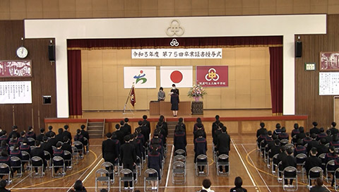 来賓、保護者の方、教職員の列席のもと、第75回卒業式が厳粛な雰囲気の中で行われました。卒業生は凛とした表情で卒業証書を受け取り、代表生徒が門出の決意を述べました。また、最後の学級活動では、どのクラスも充実した中学生活を振り返り、友人と名残を惜しむ姿が見られました。