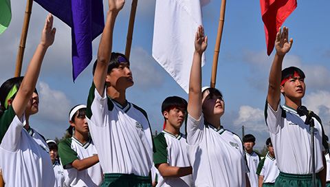 雨で延期となっていた第77回体育大会が、爽やかな気候に恵まれた今日、挙行されました。三年余りに及んだ感染症との闘いに節目を迎え、互いを応援し合う声に包まれたグラウンドには、未来にふさわしい熱気があふれました。