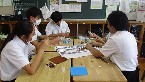子どもたちが「命」の大切さを考え、思いやりの心を見つめ直すことを目的とし、毎年この日を「絆の日」としています。今年度は、絆をテーマにした生徒会自作ドラマが上映されました。また全校生徒による壁画は「祈り」がモチーフとなっています。基本となる原画をもとに、各学級で切り絵をしていきました。子どもの創意工夫のもと、つながりを大切にした活動を継続しています。(R5.10.10)