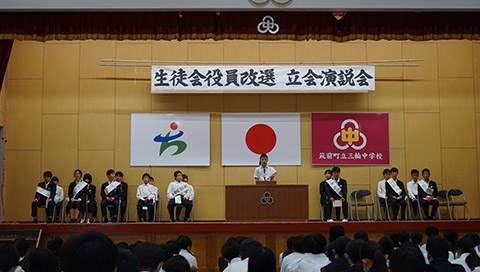 学校生活における自主的・実践的態度を育てるために、自治的雰囲気の中で生徒会活動を展開しています。本日は、生徒会本部役員にふさわしい人物を選出する、生徒会役員改選が行われました。立候補者は公約を掲げ、学校を活性化する政策を熱くアピールしました。三年後には社会参画が求められる3年生は、校内で学び、人生を主体的に切り開く力にしてほしいと思います。(R5.11.7)