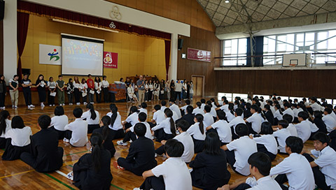 6月4日、APU(立命館アジア太平洋大学)の留学生との交流会を行いました。筑前町の英語教育グランドデザインの一環として、身につけた英語力を試したり、新たな課題を設定したりすることができる体験の場として行われています。英語が通じる喜びを感じるとともに、異文化理解につながる時間となりました。 (R6.6.4)