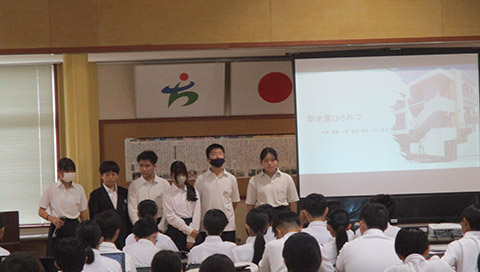 本校の1年生は、高齢者や障がい者の施設を訪問し、共助の精神を学んでいます。今年度は近隣7カ所の福祉施設で、コミュニケーションや介助の1日体験をさせていただきました。また、三井高校福祉科や筑前町社会福祉協議会の皆様にご協力いただき、学びを実生活につなぐお話をいただきました。(R6.9.9-11)
