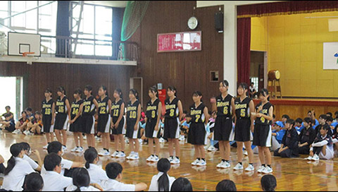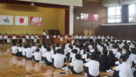 6月19日、中体連大会に向けて選手激励会が行われました。勝敗ももちろんですが、礼儀や感謝の心など、人間力が向上した子どもたちの姿に期待したいと思います。保護者や地域の皆様、ぜひ、子どもたちの応援をよろしくお願いいたします。 (R7.6.19)