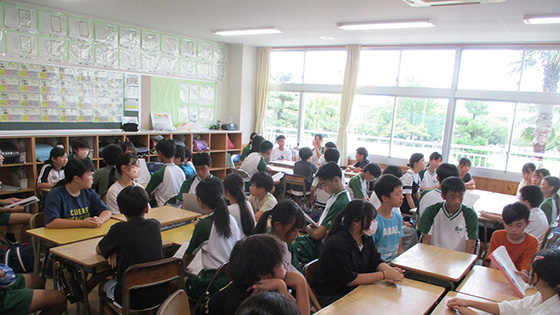 8月26日、「草場川へおいで」の取組として三輪小学校6年生との交流会を行いました。交流会では小学生に向けて、中学校での1日の生活の流れや校則、部活動についてなどを紹介し、小学生からの質問に答えました。緊張している小学生に優しく話しかけ会を進める様子に、来年度には最上級生となる自覚がだんだんと芽生える様子が伺えました。 (R7.8.26)