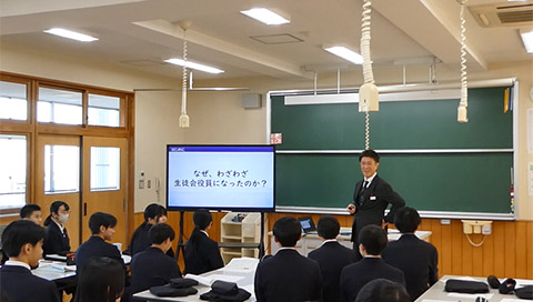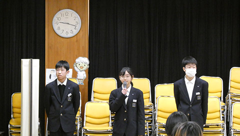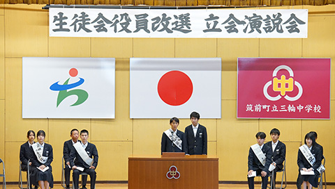 11月21日(金)に、立会演説会、新生徒会役員選挙の投票が行われ、新しい生徒会三役が決定しました。立会演説会では、堂々と自分なりの抱負や公約を語る立候補者の姿、そして、それをしっかりと受け止める生徒の姿が印象的でした。2年生を中心とし、学校文化や伝統のよさを受け継ぎながら、今の時代に合った新しい風を吹き込んでほしいと思います。地域に愛される、地域貢献できる生徒会活動を応援しています。 (R7.11.21)