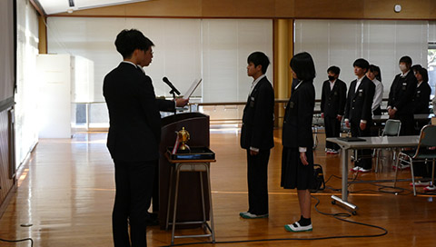 12月24日(水)に、2学期終業式を行いました。中体連新人戦の結果報告で、県大会に出場したサッカー部と男子ソフトテニス部が表彰されたほか、三輪中表彰やマラソン大会・タイピングコンテストの表彰など、多くの生徒が全校の前で表彰されました。